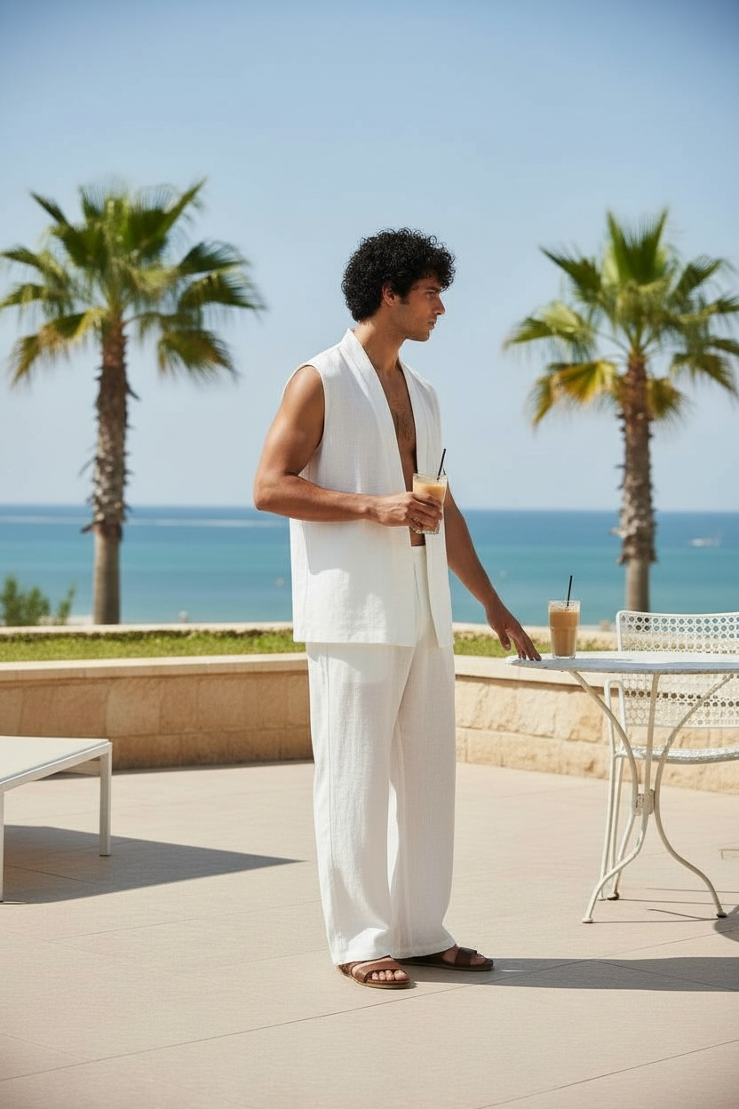 A clean, minimal two-piece set designed for effortless styling. Features an open-front linen vest paired with relaxed drawstring pants with a cinched waist. Lightweight and breathable, perfect for warm weather or layering year-round.