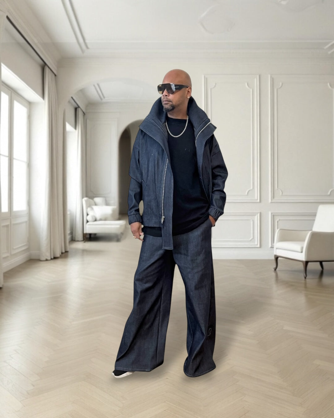 Step into luxury with this Denim Flight Jacket, a bold fusion of high-fashion detail and street wear edge. Crafted with a shimmering silver brocade fabric, this jacket makes a statement wherever you go — from nightlife to creative shoots to elevated casual wear.