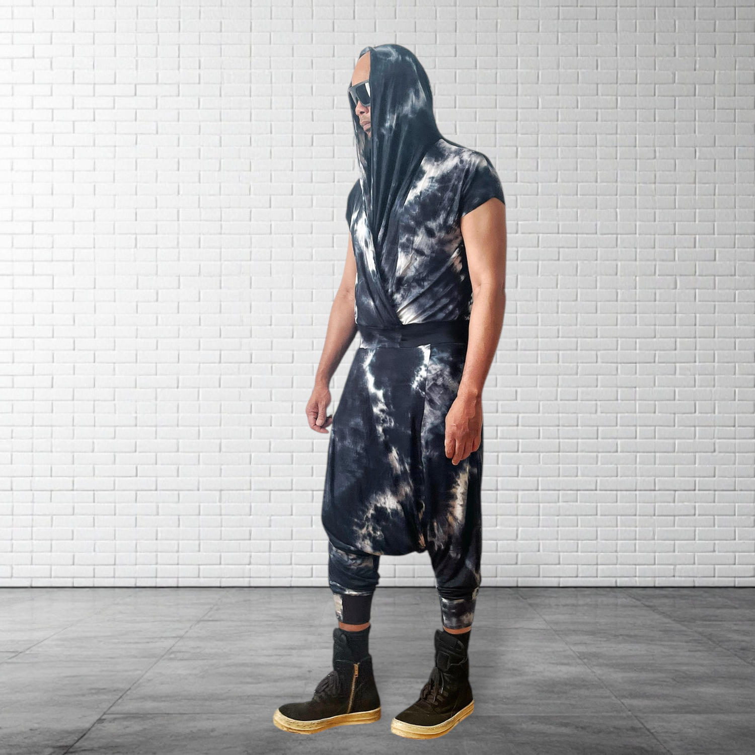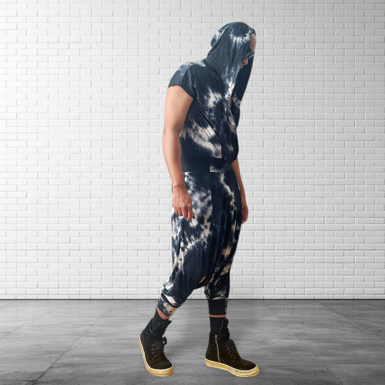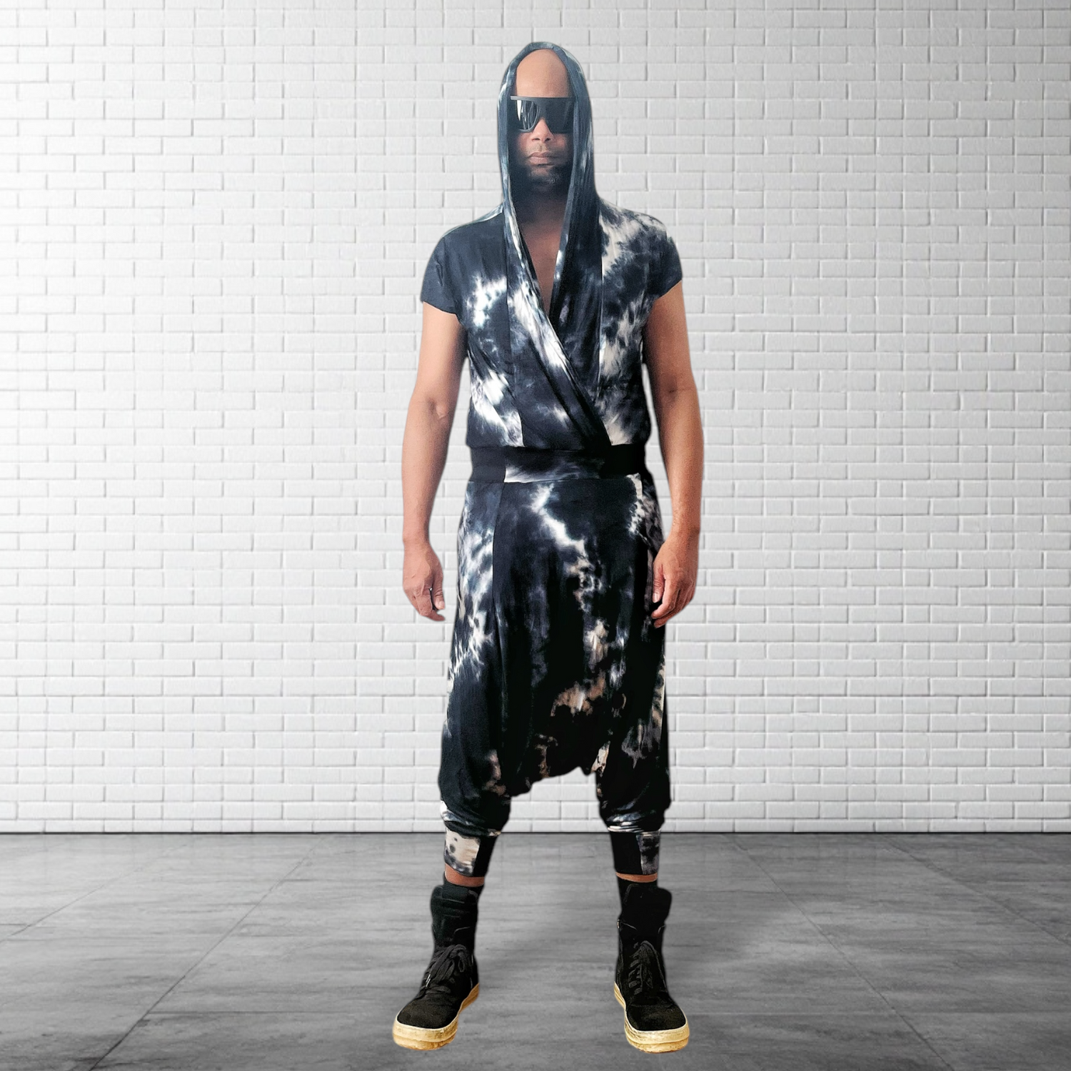 Mens Jumpsuit Drape Front Jersey Jumpsuit Cross Front attach Hoodie Tye Dye Jersey Mens Unisex