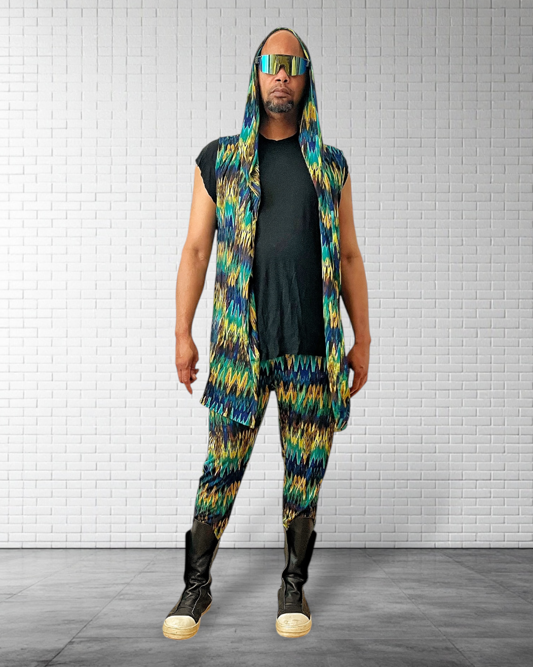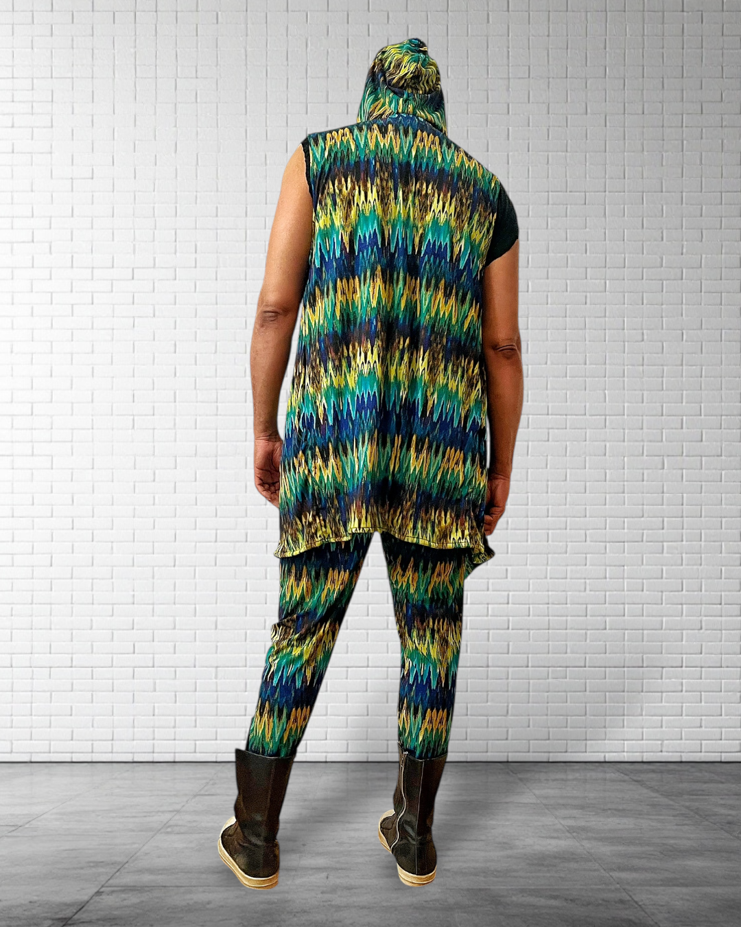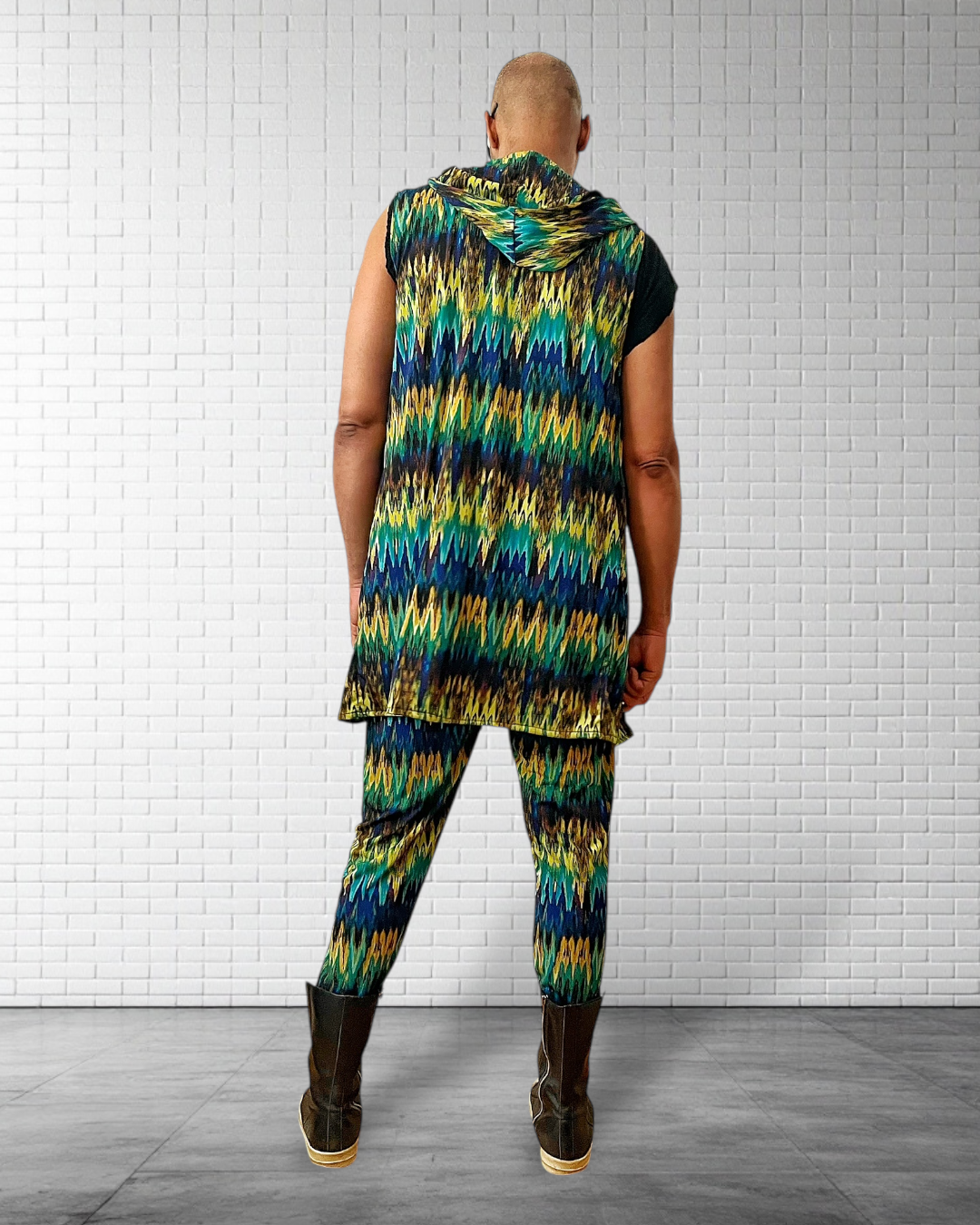 Whether you're heading to Burning Man, a summer music festival, or just want to turn heads on the dancefloor, this tribal-inspired outfit is made to make a statement. Featuring a bold ikat-style print, this set includes a sleeveless hooded cardigan and matching joggers designed for maximum impact and all-day comfort. Made from a stretch rayon printed jersey very size friendly.