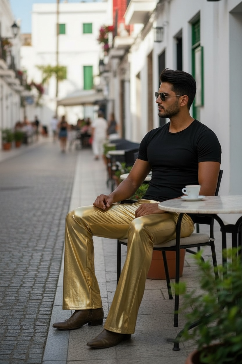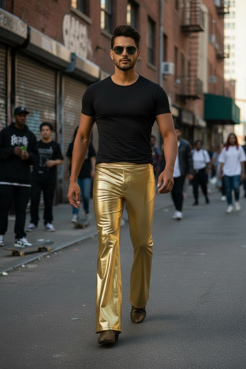 Check out this awesome metallic flared leg jeans made from a super stretch spandex with an elastic waistband. This pull on pant is similar to a legging but is more relaxed cut like a pair of jeans. It has faux fly front and waistband. If you looking for a fitted look you can size down as this pant is very size friendly. Pockets are functional. Model is 6'2' 190 and is wear Large With 34" inseam.