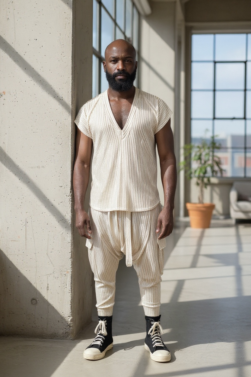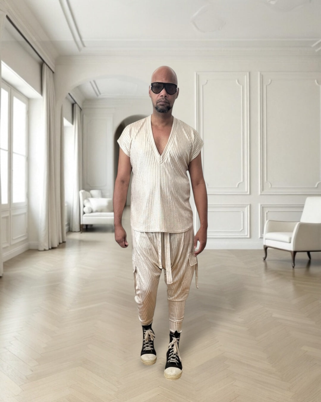 Make a statement with this futuristic yet effortlessly cool Gold rib knit shirt. Crafted from a soft, stretchy metallic ribbed fabric, this top combines comfort and shine for a look that’s bold, modern, and versatile. Designed with a deep V-neck and a relaxed fit, it’s perfect for those who love to stand out while keeping it casual.