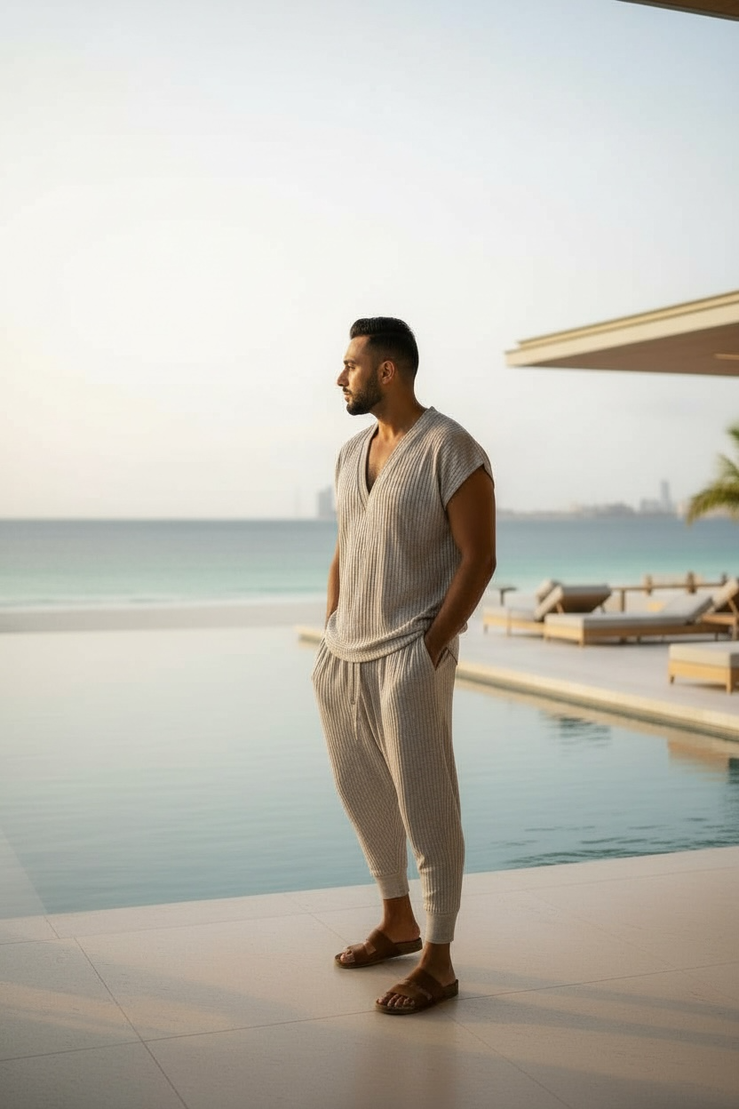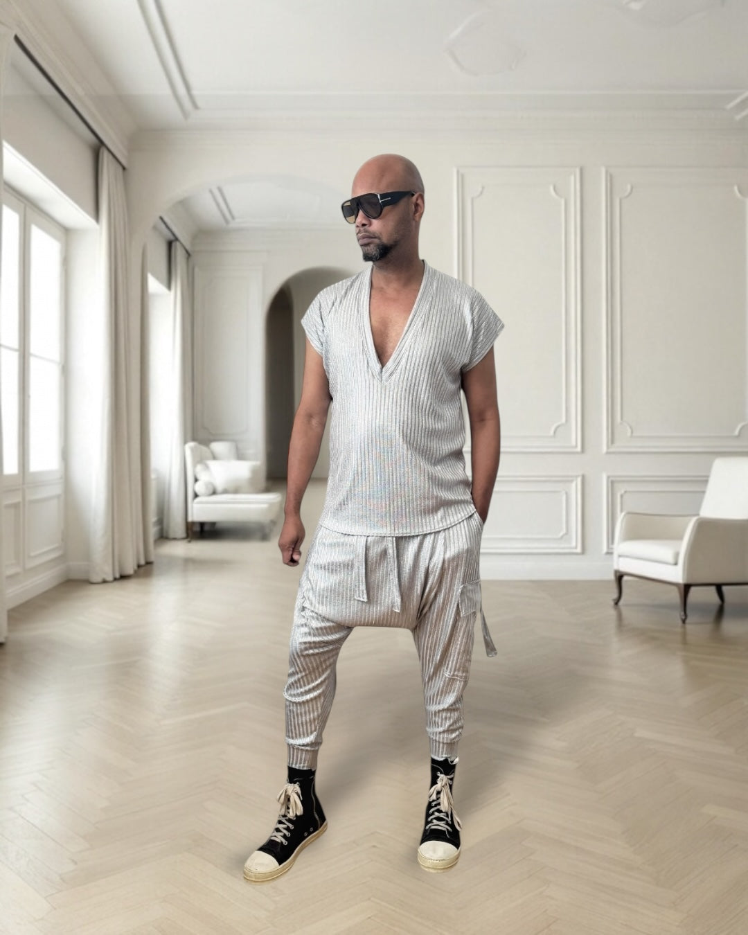 Make a statement with this futuristic yet effortlessly cool silver rib knit shirt. Crafted from a soft, stretchy metallic ribbed fabric, this top combines comfort and shine for a look that’s bold, modern, and versatile. Designed with a deep V-neck and a relaxed fit, it’s perfect for those who love to stand out while keeping it casual.