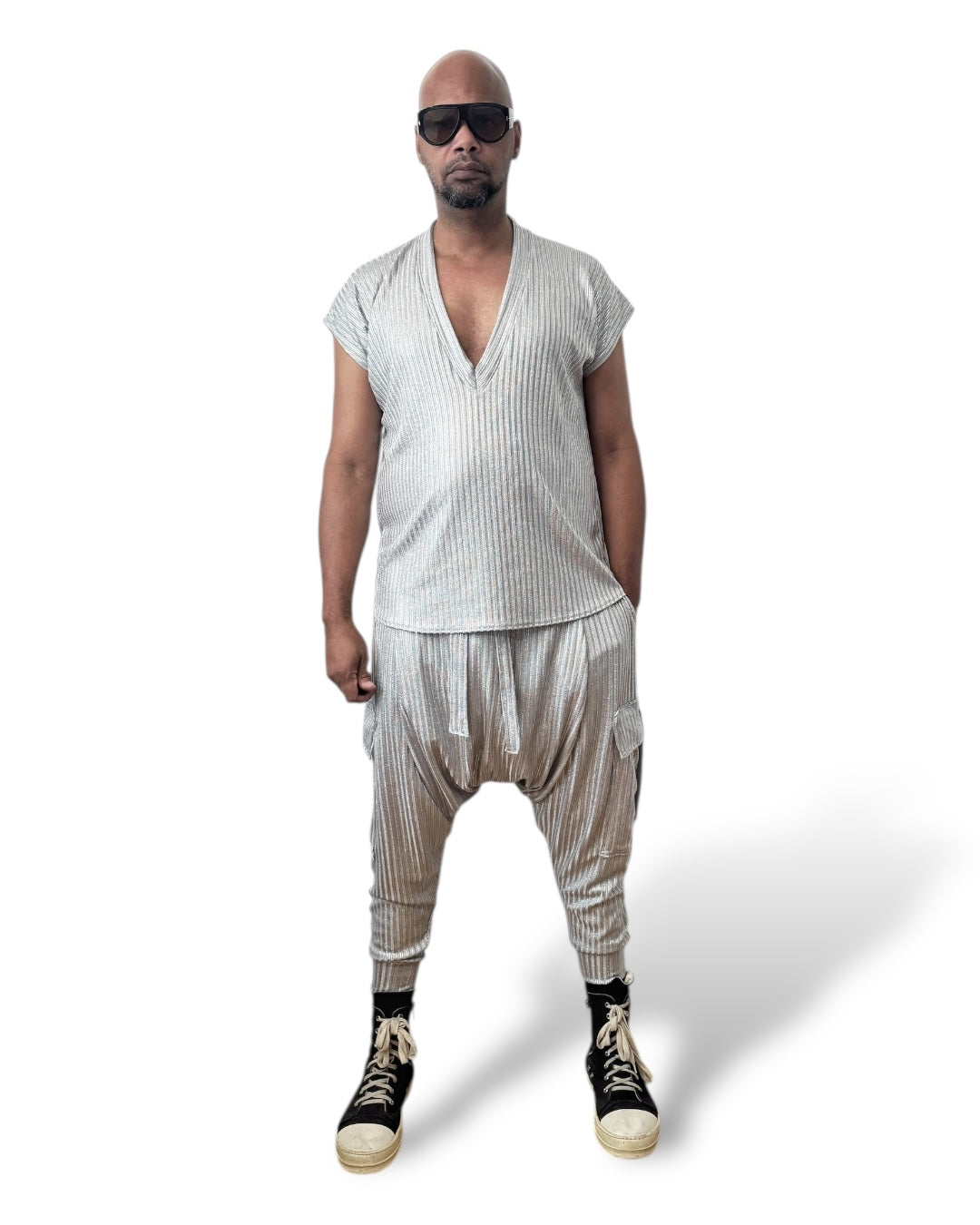 Silver Rib Knit Deep V-Neck Shirt – Unisex Metallic Lounge Top