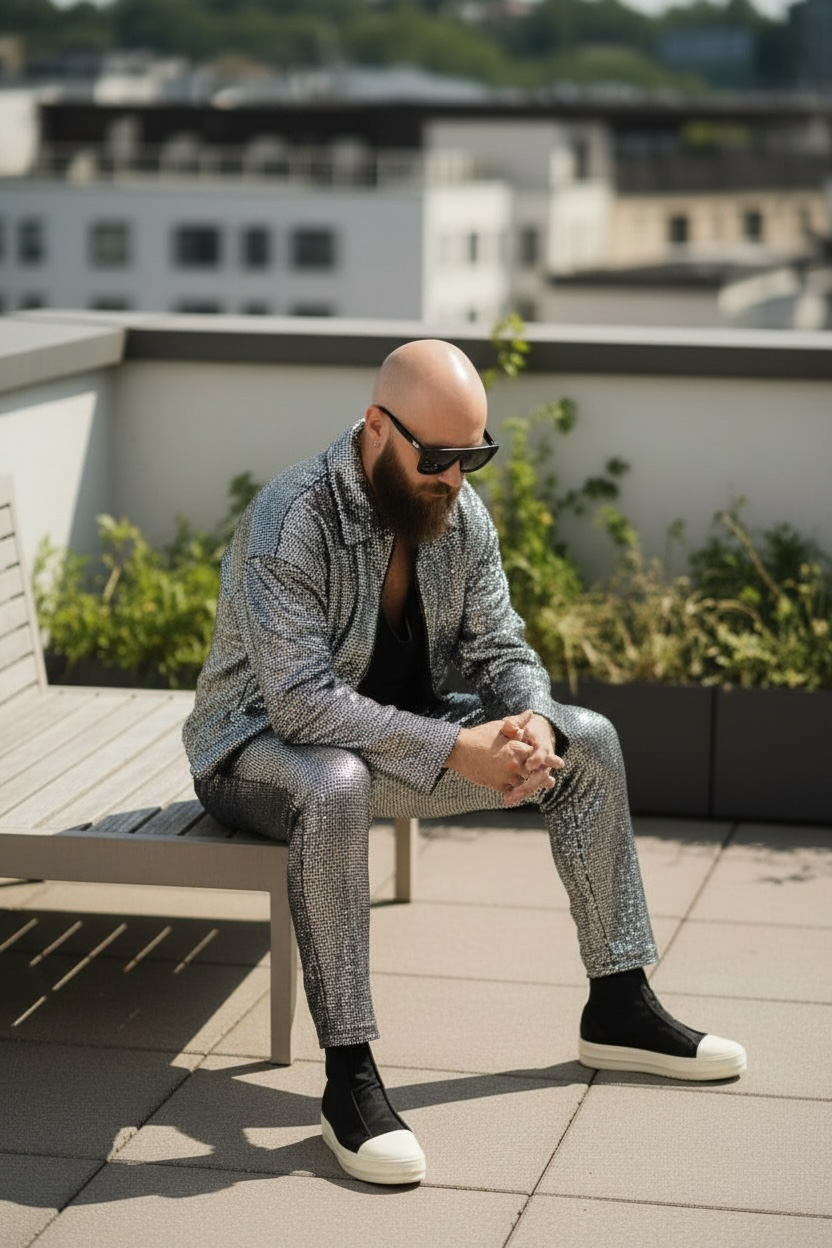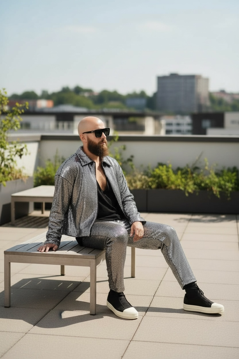 Make a bold statement with this slim cut elastic waist pant, crafted from metallic-coated spandex jersey that shimmers like a silver disco ball. This show-stopping piece features a sleek silhouette, deep side pockets for functionality, Perfect for festivals, night outs, or anyone wanting to add a futuristic sparkle to their wardrobe.
