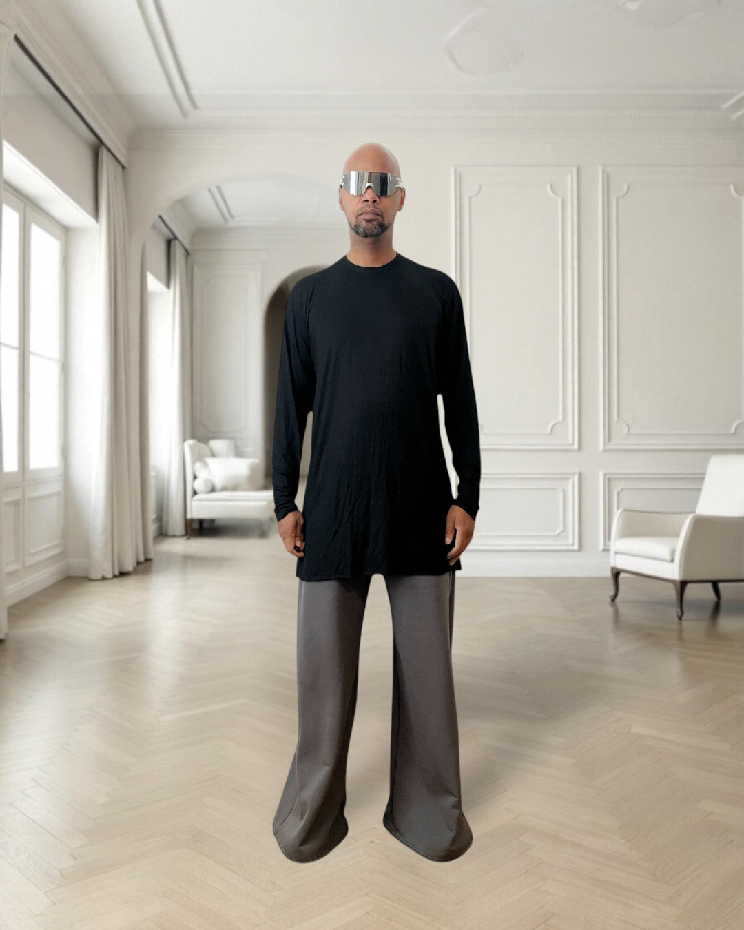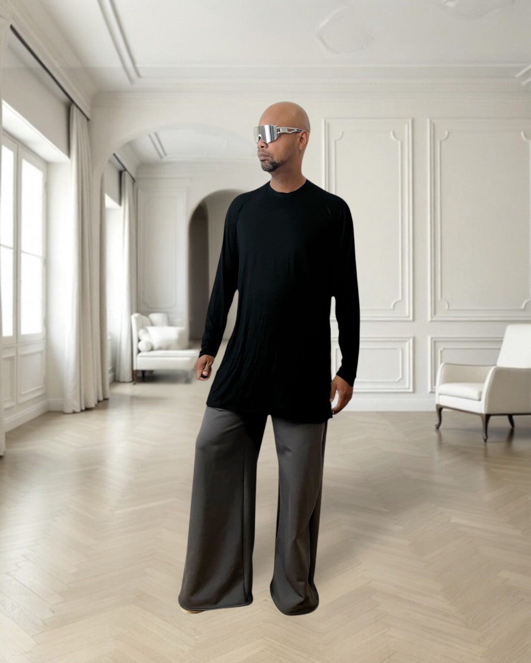 Elevate your everyday style with this Soft Black Jersy Knit Long Sleeve Shirt, designed for comfort and shine. Made from a soft, stretch metallic ribbed fabric, this top offers a futuristic edge while keeping things effortlessly wearable. The sleek crew neckline and long sleeves create a balanced silhouette that’s perfect for layering or wearing solo.