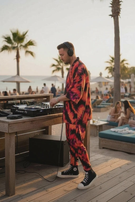 Soft rayon jersey digitally print abstract print this two-piece set blends cultural-inspired patterns with modern resort wear festival rave wear energy. The fireside Print is UV Reactive \ Black light approved.