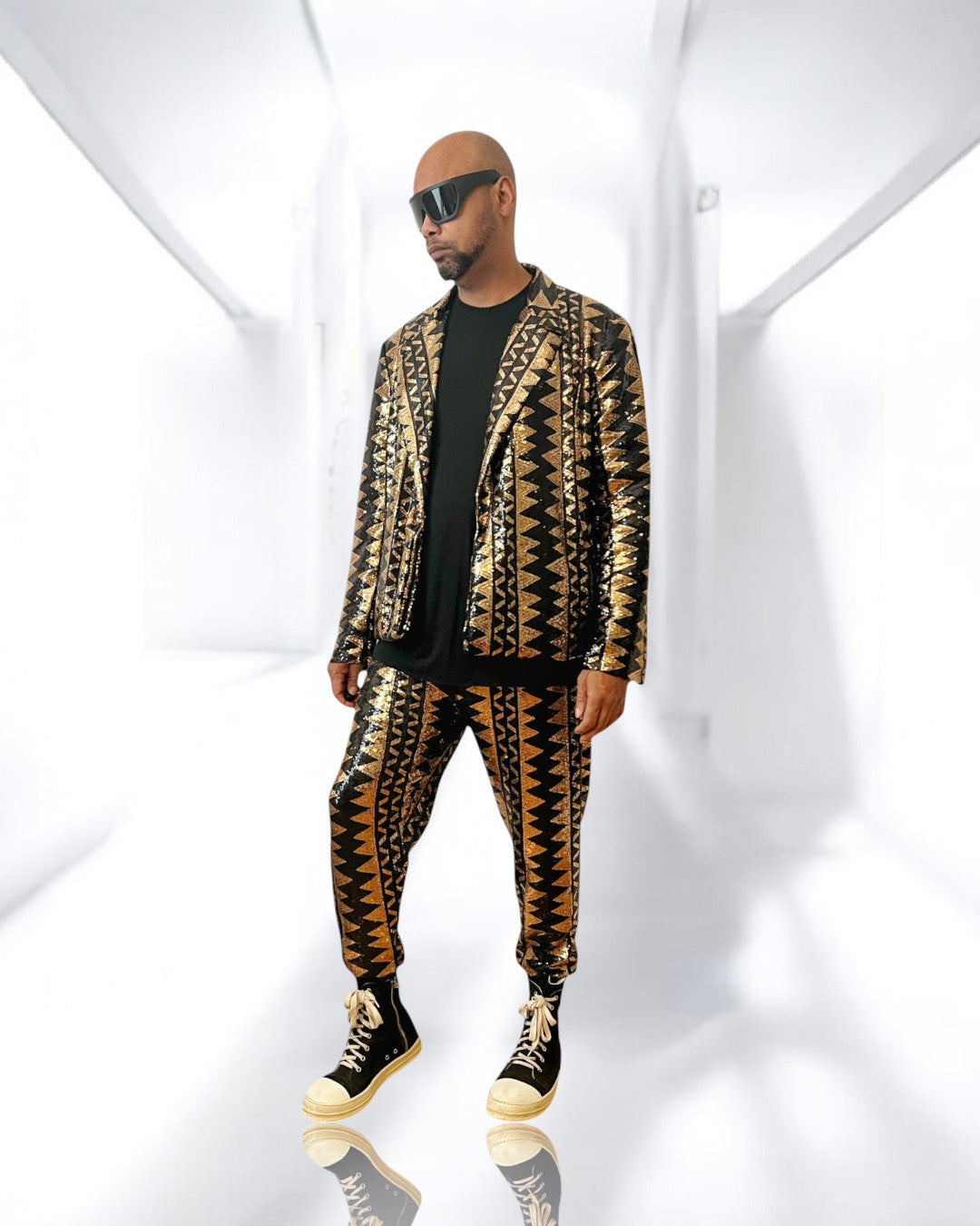 Get ready to sparkle and stand out at any festival or event with this stunning Gold and black tribal pattern sequins Mens Pant Stretchy Pull On Trouser Jogger With Pockets. This unique piece features tribal pattern sequins that catch the light with every move, design ensures comfort and warmth.